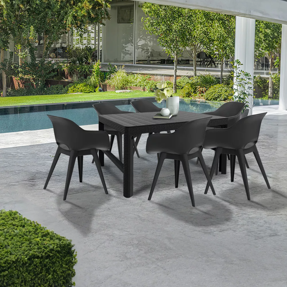 Az UV sugárzásnak és az időjárás viszontagságainak is ellenálló műanyagból készült a Dina 6+1 garnitúrája. Egész évben használható, tartós és stabil műanyaból készült, ezért egy időtálló választás ez a garnitúra. A bútor szett ideálisan beleillik minden ház körüli térbe, ahol ideális helyet teremt a szabad levegőn való pihenéshez.