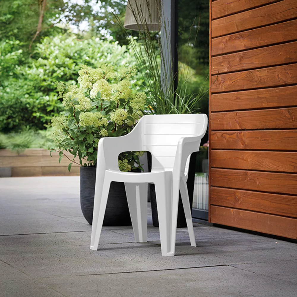 A Keter Bilboa Lowback műanyag kartámaszos kerti szék nemcsak esztétikus, hanem okosan praktikus is. A vízelvezető nyílás gondoskodik arról, hogy az eső vagy öntözés után ne maradjon víz a felületen, így mindig használatra kész. Az egymásra rakható kialakításnak köszönhetően pillanatok alatt helyet szabadíthatsz fel, ha épp nincs szükség az összes székre. Az időjárásálló műanyag garantálja, hogy éveken át stílusos marad – sem nap, sem eső nem fog ki rajta.