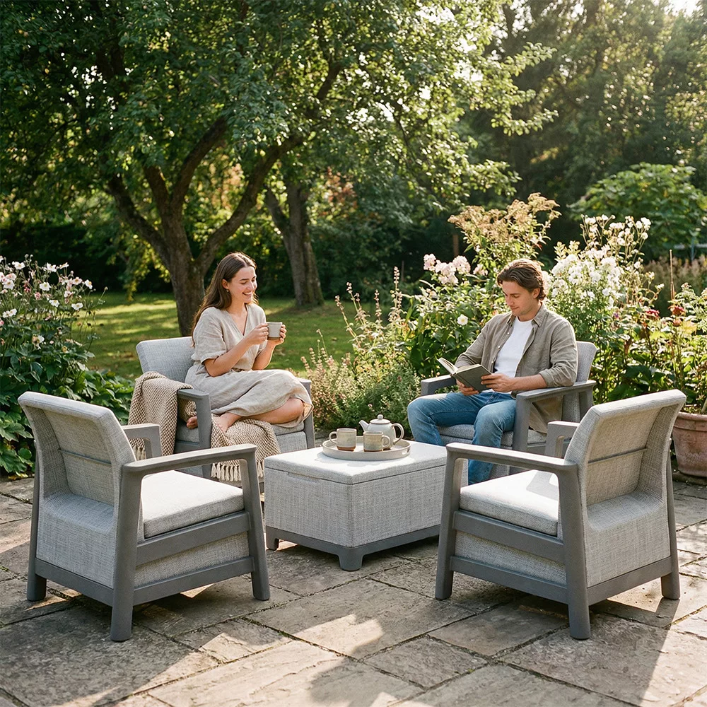 A szett kényelmes beszélgetősarkot alakít ki a kertben vagy a teraszon. Egységes, modern kültéri nappali hozható létre vele, miközben a tárolós asztal praktikus helyet biztosít a kiegészítőknek. Időjárásálló, gondozásmentes megoldás, amely rendezetten és átgondoltan formálja a kültéri teret.
