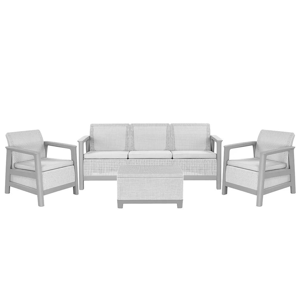 A szett kényelmes beszélgetősarkot alakít ki a kertben vagy a teraszon. Egységes, modern kültéri nappali hozható létre vele, miközben a tárolós asztal praktikus helyet biztosít a kiegészítőknek. Időjárásálló, gondozásmentes megoldás, amely rendezetten és átgondoltan formálja a kültéri teret.