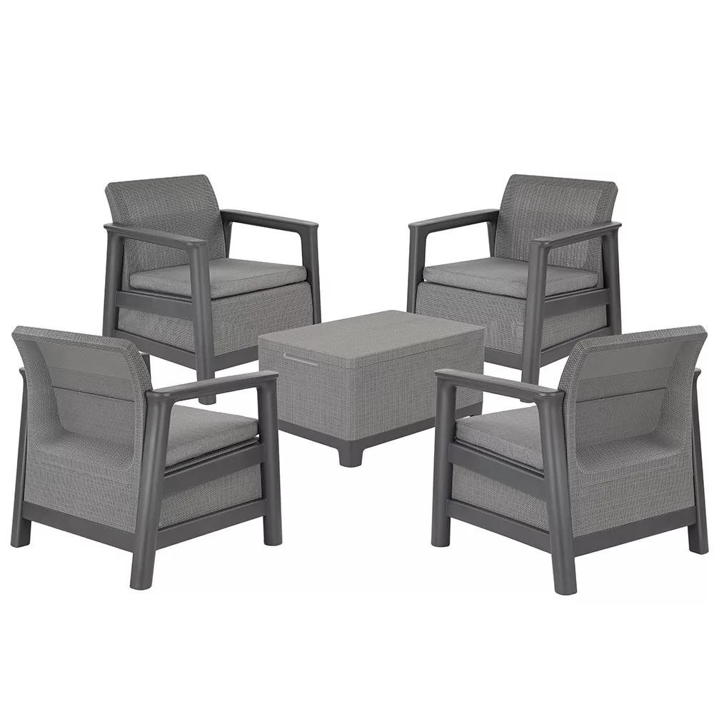 A Scandi Quartet set kerti bútor garnitúra letisztult, egységes megjelenést ad kertben vagy teraszon. A grafit-hűvösszürke szín természetes hatású, jól illeszkedik zöld környezethez és modern burkolatokhoz. A 4 fotel és a tárolós asztal együtt kényelmes, kompakt kültéri ülőgarnitúrát alkot pihenéshez és beszélgetésekhez.