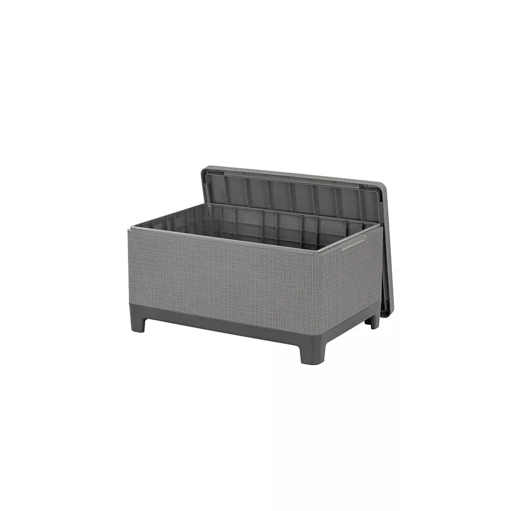 A modell egyik fő funkcionális eleme a zárt belső tárolótér, amely lehetőséget biztosít kisebb kiegészítők vagy használati tárgyak elhelyezésére. A tárolórekesz segíti a rendezett kültéri környezet kialakítását, miközben az asztallap továbbra is használható lerakófelületként. A tároló és az asztalfunkció kombinációja praktikus megoldást kínál olyan helyeken, ahol a helytakarékosság és az átgondolt kialakítás kiemelt szempont. Az asztal gyorsan és egyszerűen összeszerelhető, így rövid idő alatt használatba vehető.