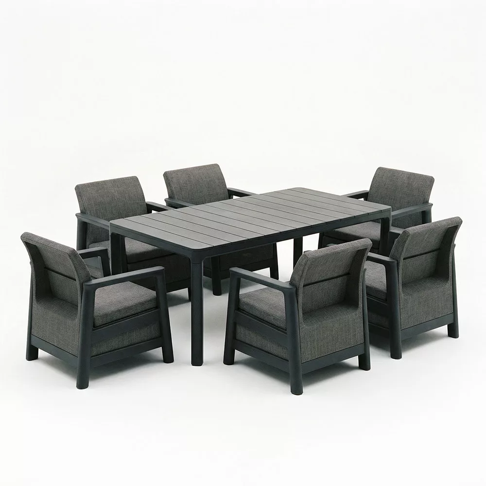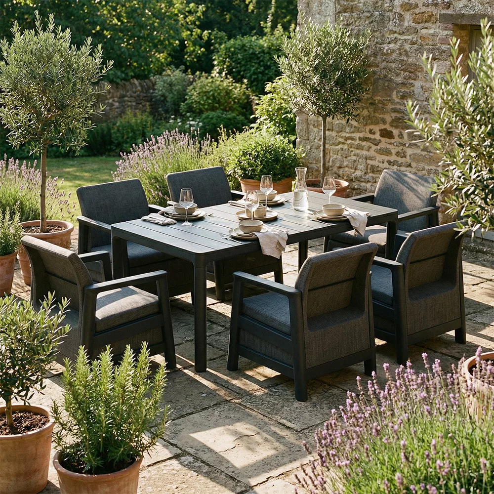 Ideális választás azok számára, akik grafit-hűvösszürke kerti bútor szettet keresnek, időjárásálló műanyag kültéri bútort szeretnének, kertbe, teraszra vagy erkélyre. Stabil, modern és hosszú távon is kényelmes kültéri ülőgarnitúra.