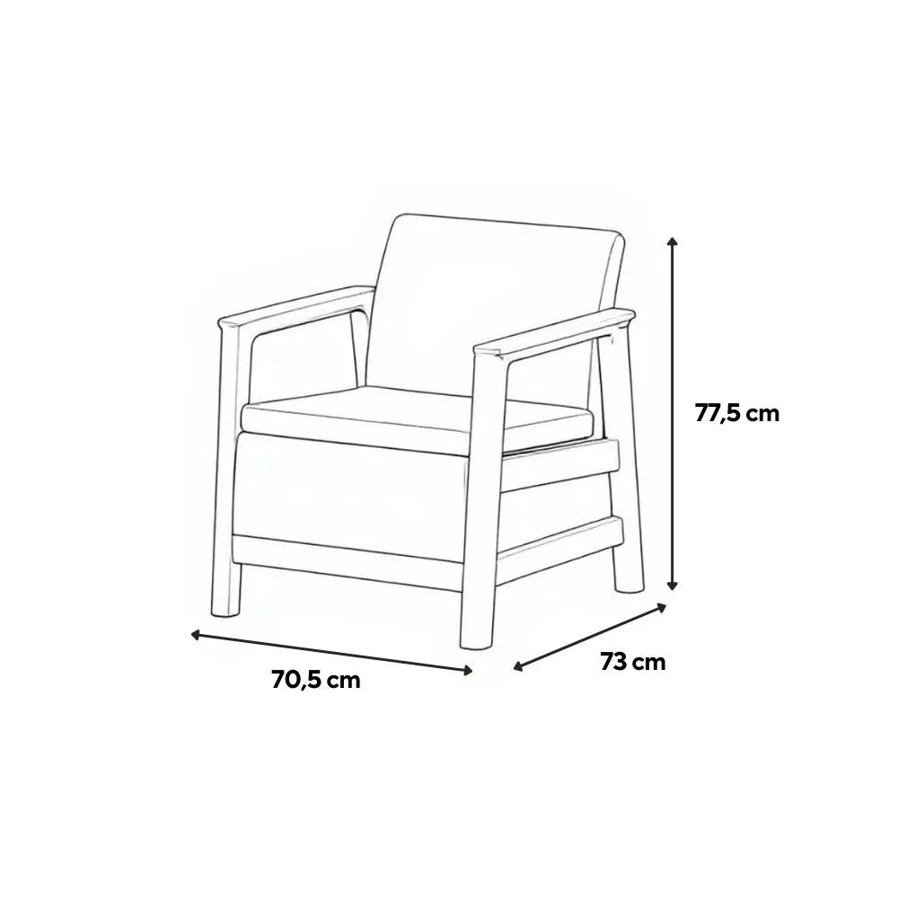A szett eső nedvesség és UV álló műanyagból készült, így kültéri használatra optimalizált megoldás. Nem igényel külön felületkezelést, ellenáll az időjárási hatásoknak, hosszabb ideig megőrzi színét és stabilitását, tisztítása pedig egyszerű. A stabil lábszerkezet és a karfás kialakítás kényelmes alátámasztást biztosít. A fotel arányos és jól kihasználható ülőhelyet kínál. Tartós kerti bútor választás mindennapi használatra.
