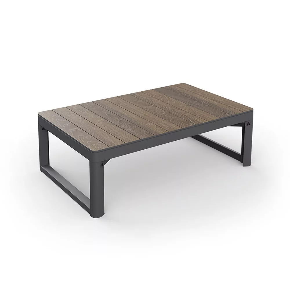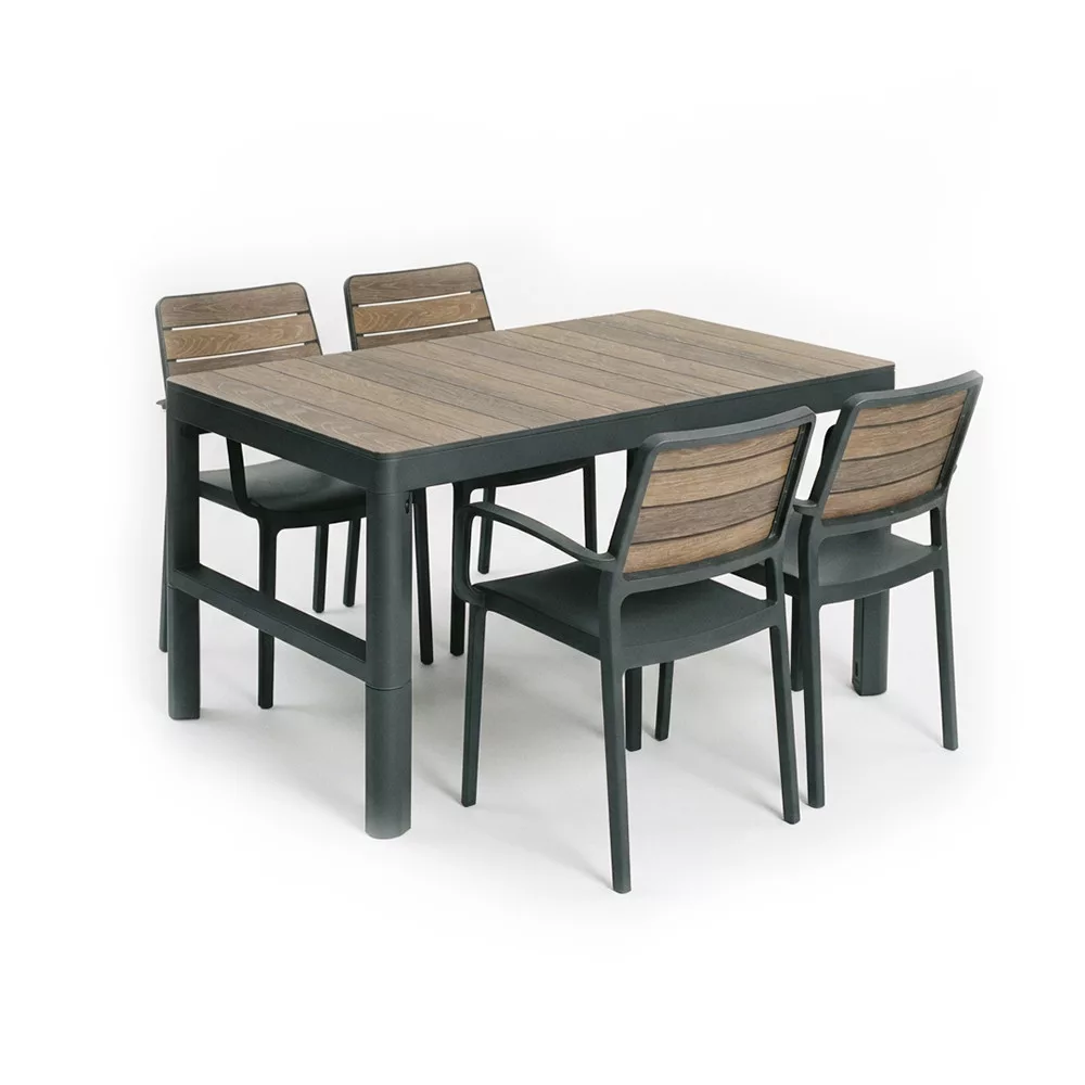 A DecoCoat technológiának köszönhetően az asztal természetes fa hatású felületet kapott, amely elegáns megjelenést biztosít a kertben vagy a teraszon. A felület ellenáll a karcolásoknak és a mindennapi használatból eredő igénybevételnek.