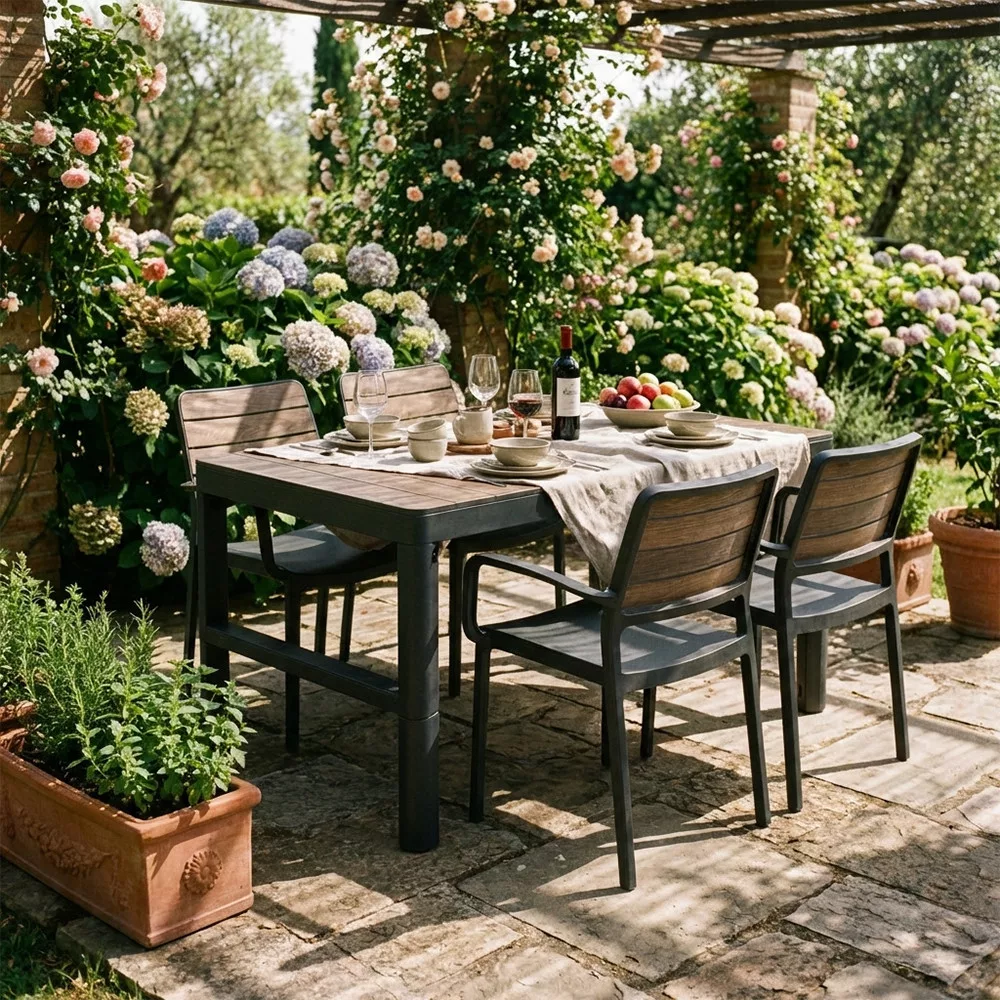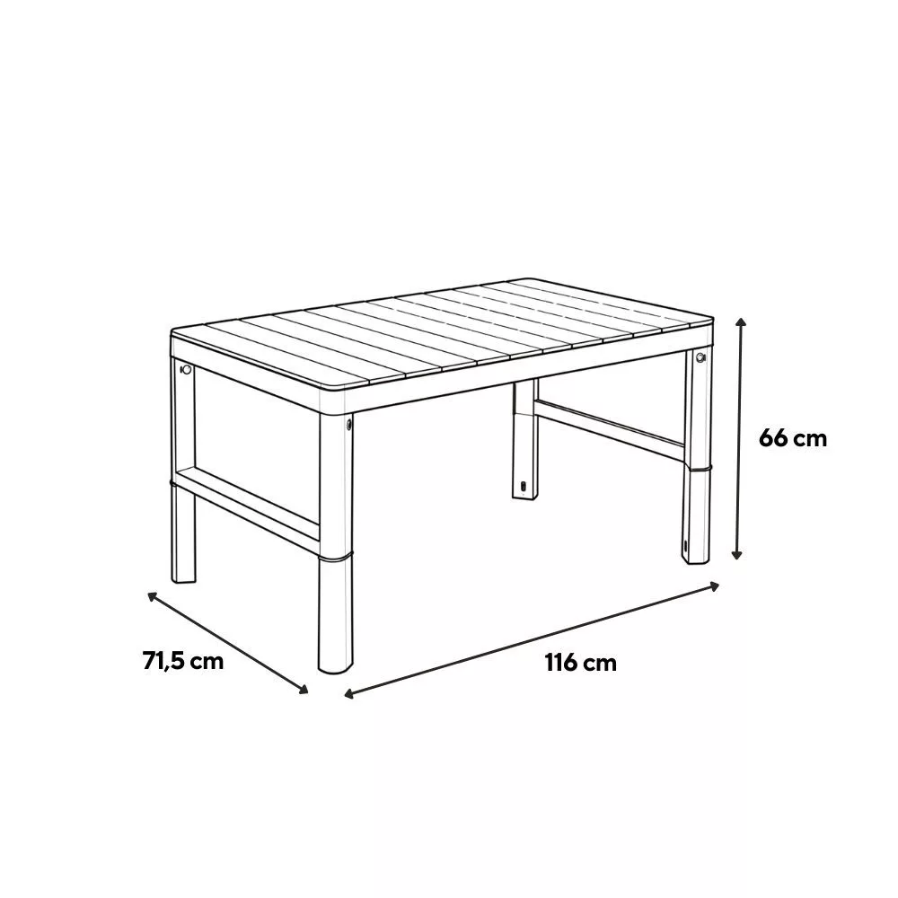 A masszív műanyag szerkezet ellenáll az UV-sugárzásnak és a különböző időjárási körülményeknek, így az asztal kültéri használatra is ideális választás.