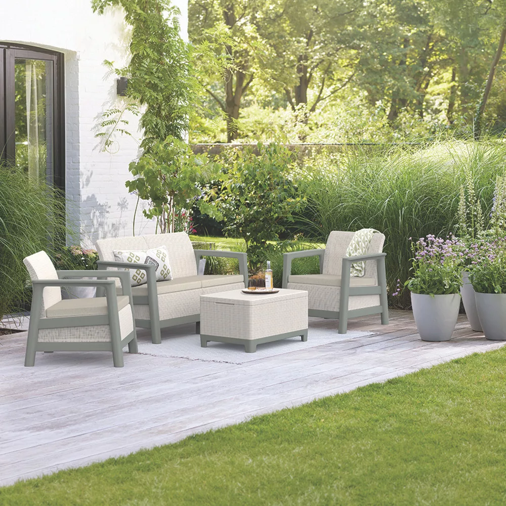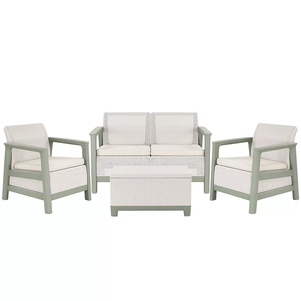 A szett kényelmes beszélgetősarkot alakít ki a kertben vagy a teraszon. Egységes, modern kültéri nappali hozható létre vele, miközben a tárolós asztal praktikus helyet biztosít a kiegészítőknek. Időjárásálló, gondozásmentes megoldás, amely rendezetten és átgondoltan formálja a kültéri teret.