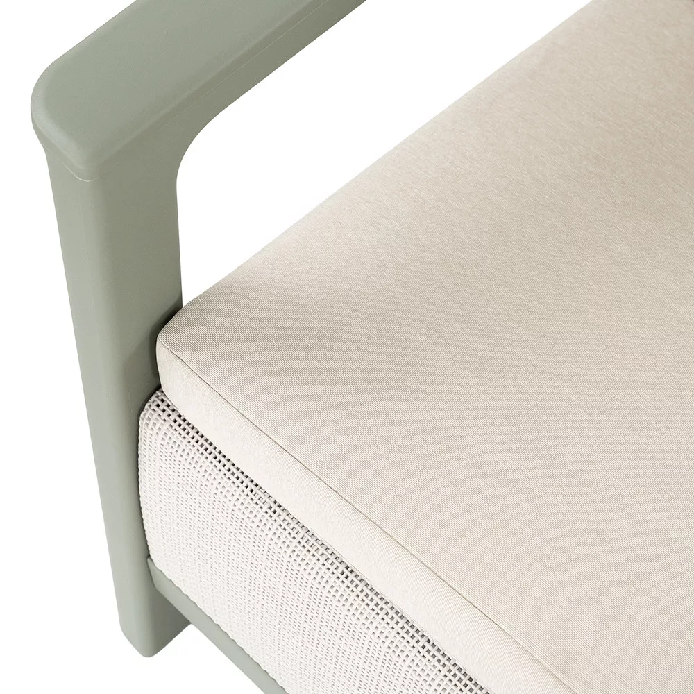 A Scandi Linea kerti bútor szett letisztult, egységes megjelenést ad kertben vagy teraszon. A zsálya zöld-homok szín természetes hatású, jól illeszkedik zöld környezethez és modern burkolatokhoz. A két fotel, a 2 személyes kanapé és a tárolós asztal együtt kényelmes, kompakt kültéri ülőgarnitúrát alkot pihenéshez és beszélgetésekhez.