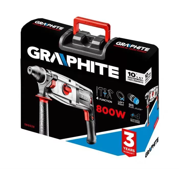 GRAPHITE nagy teljesítményű, 800 W –os SDS+ fúrókalapáccsal lehet fúrni és ütvefúrni, vésni, amit a kivételesnek számító véső fokozatmentes szögbeállítási lehetőséget kihasználva nagyon precízen lehet kivitelezni. A nagy teljesítmény lehetővé teszi a fúrást a fúrókalapáccsal betonban és téglában 28 mm átmérőig, fában 30 mm-ig, acélban pedig 13 mm-ig. A fúrókalapács orsójának forgásiránya megváltoztatható, sebessége fokozatokban szabályozható, az indítókapcsoló pedig fel van szerelve a folyamatos üzemet kapcsoló reteszeléssel. Fúrásnál a max fordulatszám 1200/min , ütvefúrásra állítva pedig 5 300 ütés percenként. A 3,2 J-os ütési energiával a fúrókalapács megbirkózik a legellenállóbb fallal is. A készletben található tartalék fúrószár, fúrótokmány, befogó adapter és kényelmes hordtáska. A CE tanúsítvány bizonyítja az európai szabványoknak való megfelelést.