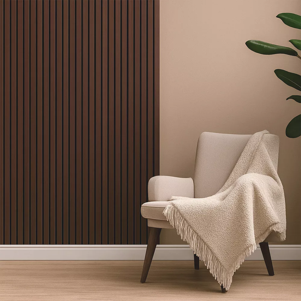 A 25 mm széles lécek 15 mm-es hézagokkal modern, ritmusos mintát alkotnak, amely javítja a hanghullámok elnyelését és szóródását. A sötét akusztikai háttér kiemeli a dió árnyalat eleganciáját, míg az egyszerű rögzíthetőség lehetővé teszi falra vagy mennyezetre való telepítését otthonokban, irodákban és vendéglátóhelyeken egyaránt.