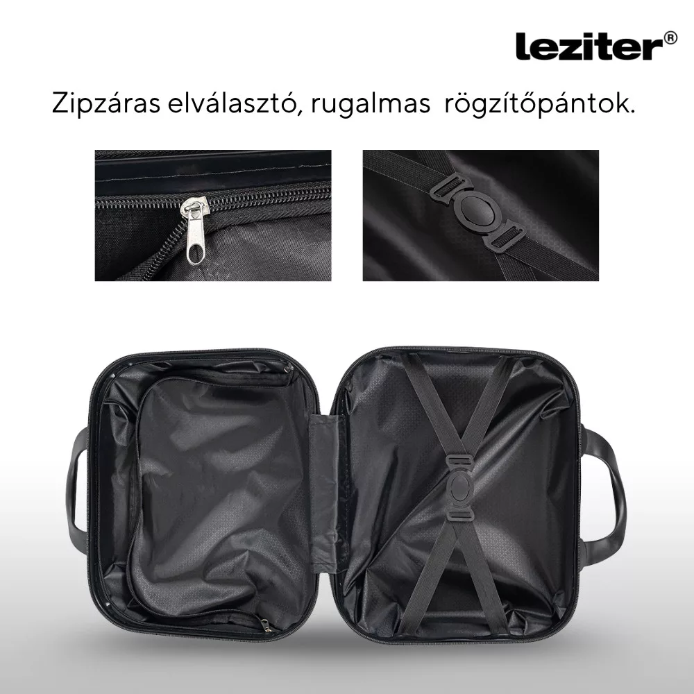 A belső tér cipzáras elválasztóval és rugalmas rögzítőpántokkal van ellátva, így a kisebb tárgyak nem borulnak össze, és mindig minden a helyén marad. A hátoldali pánt segítségével a neszeszer könnyedén rögzíthető egy nagyobb gurulós bőrönd húzószárára – ez különösen előnyös, ha több csomaggal utazol. Szabad kezek, gördülékeny haladás.
