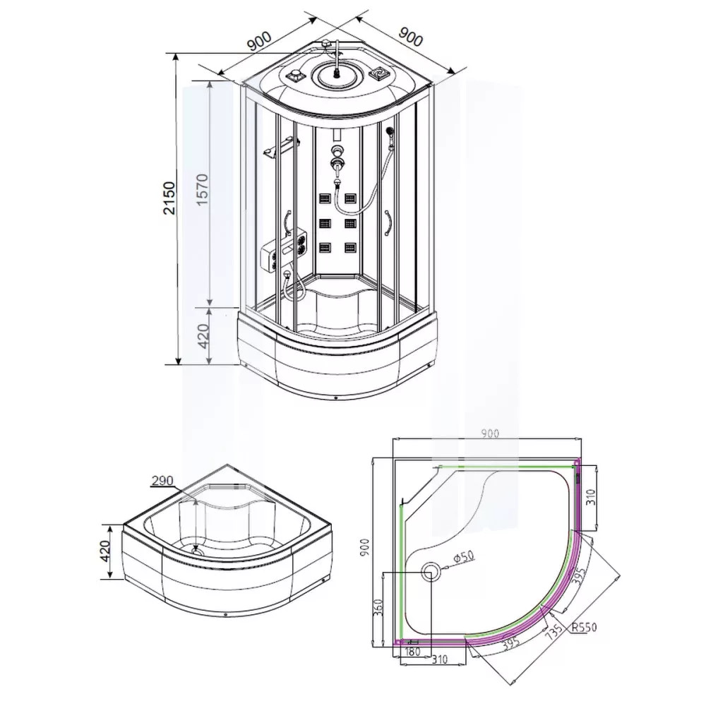 - 80×80 cm, 90×90 cm, 100×100 cm (íves vagy szögletes kabinok esetén)