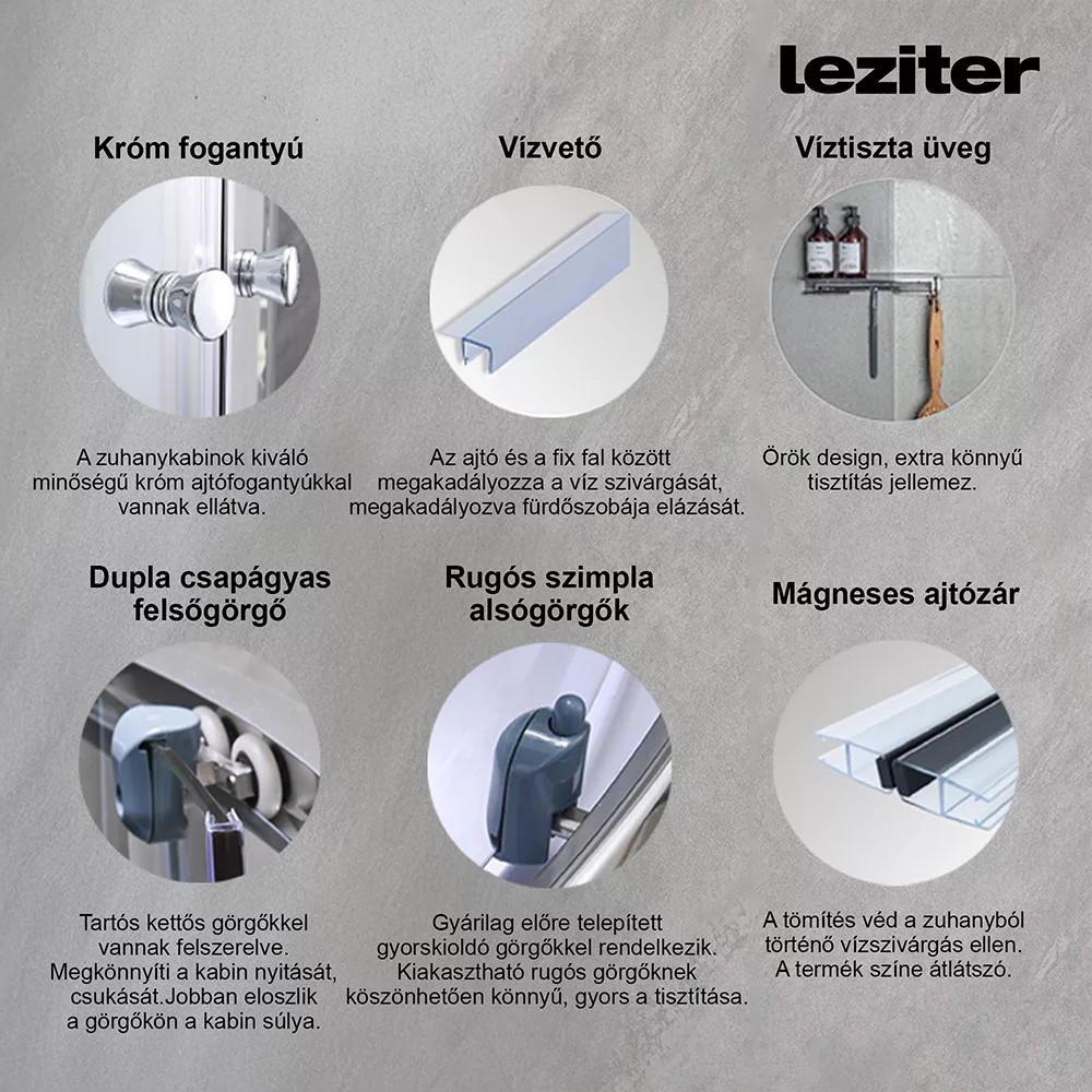 Az üveg és a profilok tisztításához enyhe mosogatószer, semleges üvegtisztító vagy hígított citromsavas oldat és puha mikroszálas kendő javasolt. Zuhanyzás után gumilehúzóval távolítsd el a vizet a vízkő ellen. Kerüld az erősen lúgos/savas vegyszereket, dörzsszivacsot és oldószereket.