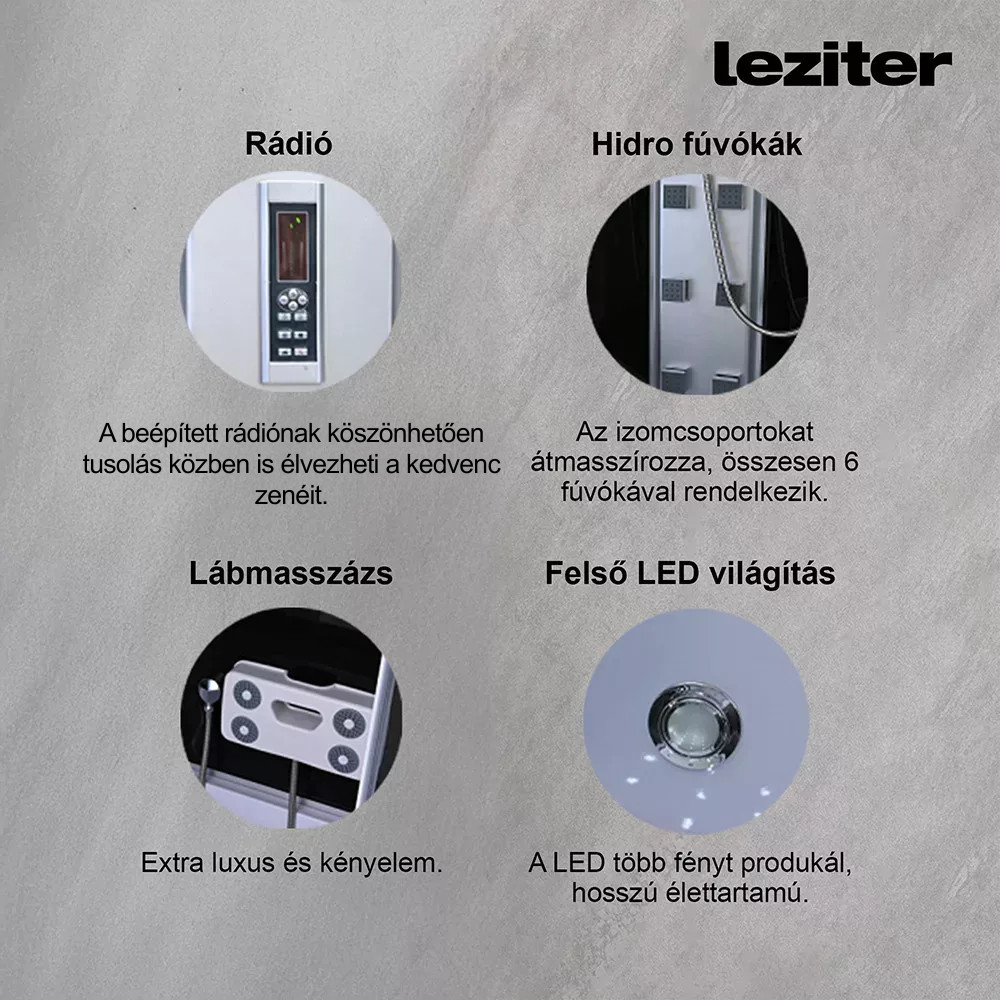 A beépített rádiónak köszönhetően zuhanyzás közben is hallgathatók kedvenc zenék vagy rádióműsorok. A felső LED világítás kellemes, hangulatos fényt biztosít a zuhanykabin belsejében, amely tovább erősíti a wellness élményt.