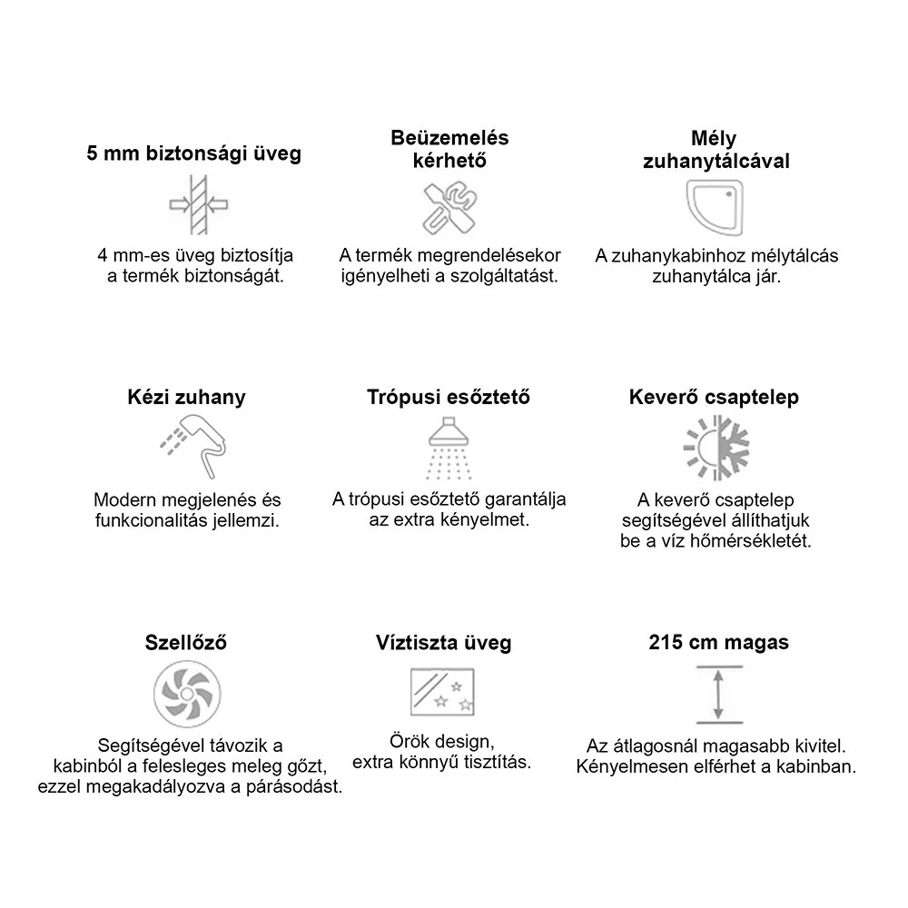 A zuhanykabin 4 mm vastag edzett biztonsági üveggel készül, amely ellenáll a mindennapi igénybevételnek. Törés esetén apró, tompa darabokra esik szét, így biztonságos választás családi környezetben is. A mélytálcás kialakítás stabil belépést és kényelmes használatot biztosít.