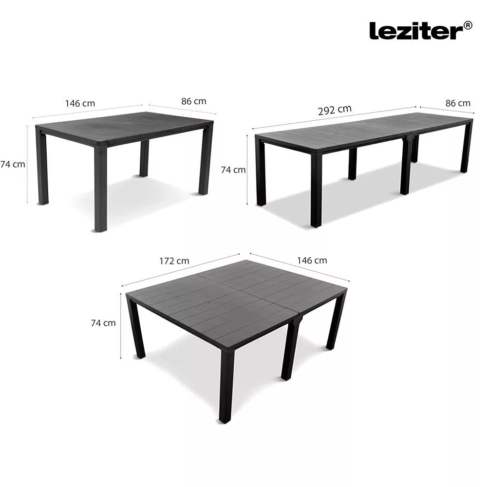 A Luno 8+1 kerti bútor garnitúra grafit színben sokoldalú és hosszú távon megbízható választás kültéri használatra. A bővíthető asztal és a rakásolható székek kombinációja lehetővé teszi, hogy a bútor szett könnyen alkalmazkodjon a mindennapi használathoz és a nagyobb összejövetelekhez is.