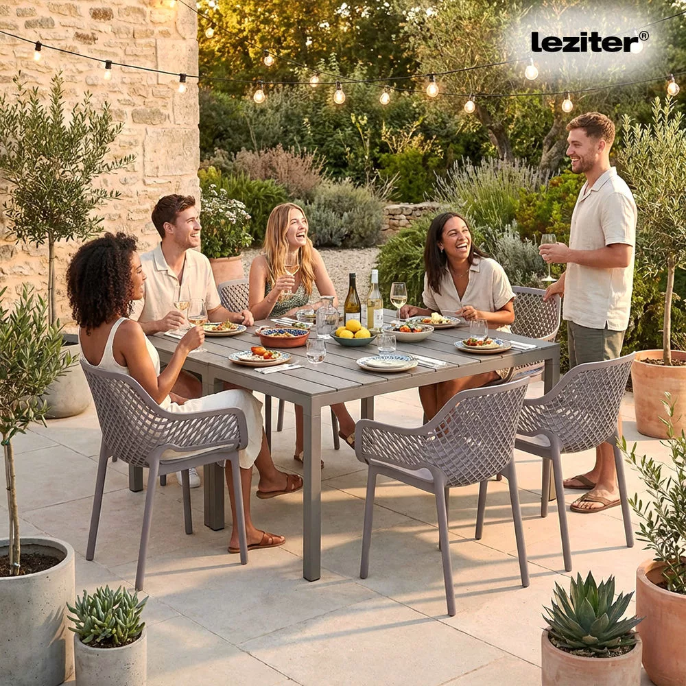 A rakásolható Letino székek kényelmes ülőpozíciót nyújtanak, és használaton kívül egyszerűen tárolhatók. Az időjárásálló anyagok ellenállnak a napsütésnek, esőnek és a mindennapi igénybevételnek, így a szett egész szezonban gondtalanul használható.