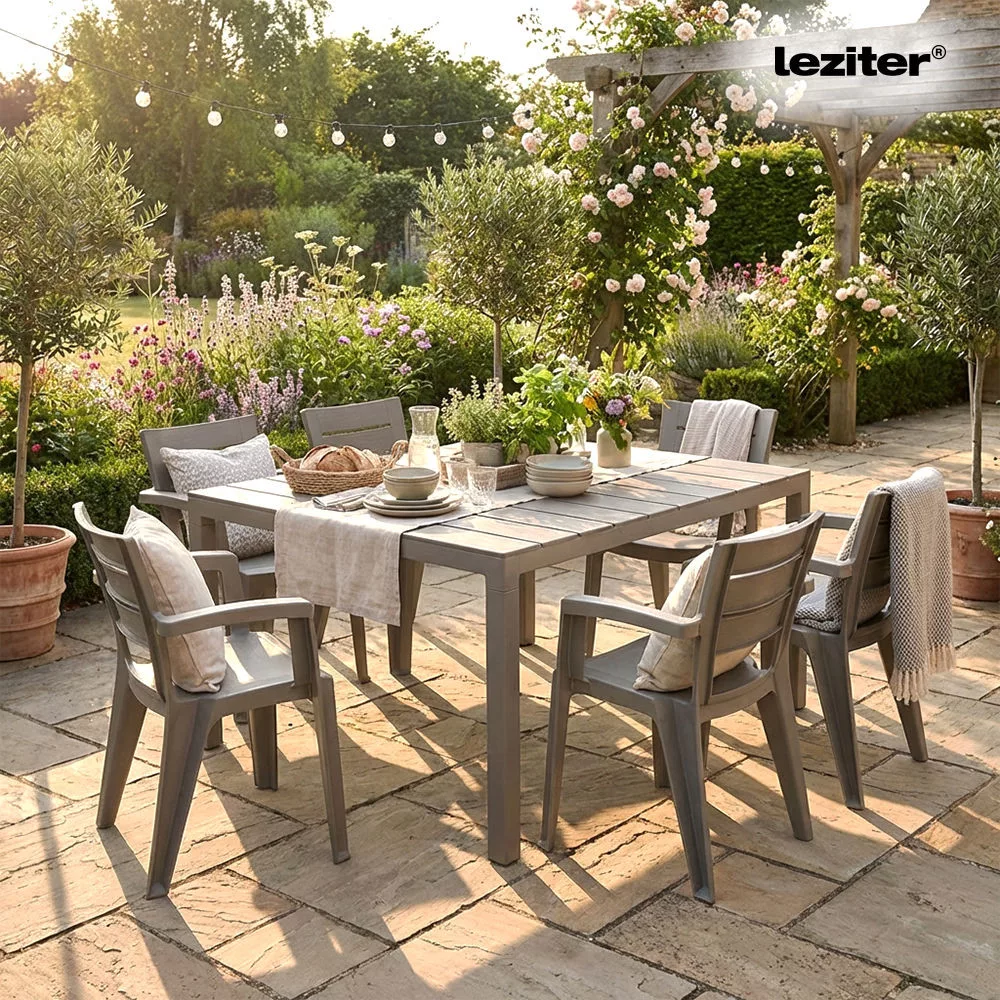 Az időjárásálló kialakítás ellenáll a napsütésnek, esőnek és a mindennapi használat során fellépő igénybevételnek, miközben a modern cappuccino szín letisztult, elegáns megjelenést biztosít a kültéri térben.