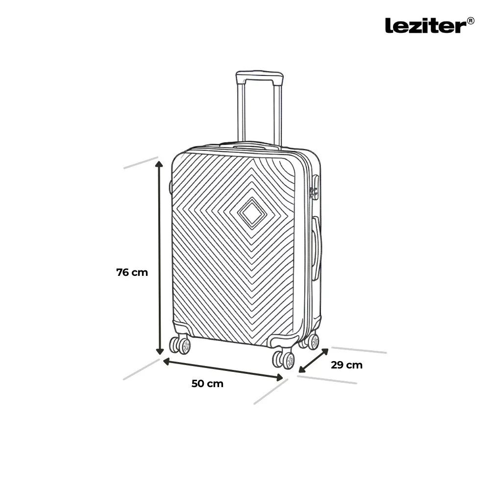Tartalom és méretek: Neszeszer: 23 × 30 × 14 cm | 11 liter | 0,77 kg Kabinbőrönd: 55 × 40 × 20 cm | 38 liter | 2,6 kg Közepes bőrönd: 68 × 45 × 25 cm | 60 liter | 2,65 kg Nagy bőrönd: 76 × 50 × 29 cm | 100 liter | 3,3 kg