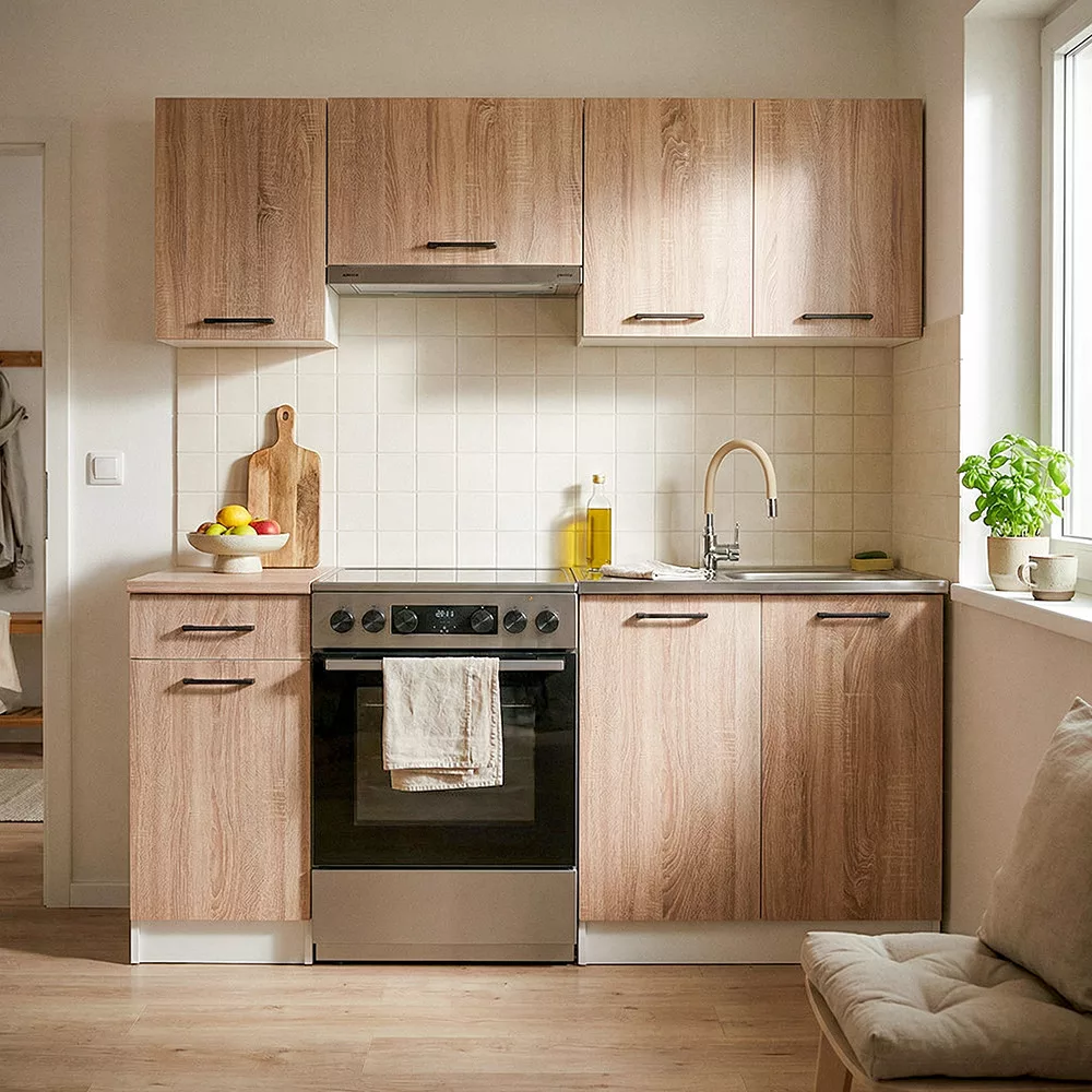A bútor 16 mm vastag laminált bútorlapból készül, amely strapabíró, könnyen tisztítható, és a mindennapi konyhai használat során is megőrzi esztétikus megjelenését. A 28 mm-es munkalap színazonos dekor élzárással extra stabilitást és hosszú élettartamot biztosít, miközben könnyen tisztán tartható, így a konyha mindig higiénikus és rendezett maradhat. A korpusz elemek színazonos ABS élzárással készülnek, ami tovább növeli a tartósságot.