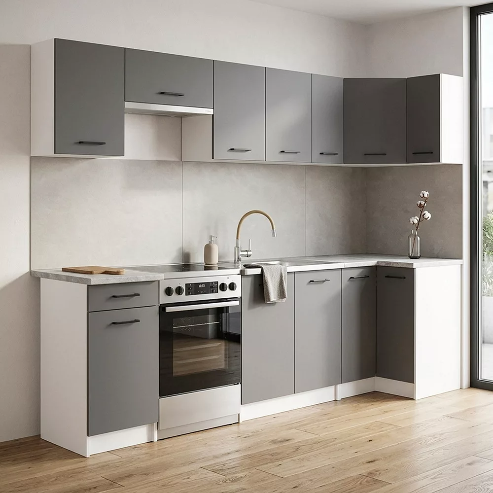 A Praktik sarok konyhabútor fehér korpusszal és antracit fronttal időtálló, letisztult megjelenést kínál, amely könnyedén illeszkedik bármilyen lakberendezési stílushoz. Világos színvilága optikailag tágítja a teret, így ideális választás különböző méretű konyhákba.