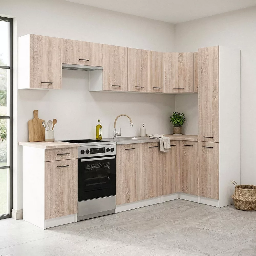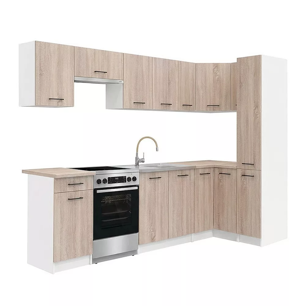 A Praktik sarok konyhabútor fehér korpusszal és sonoma tölgy fronttal időtálló, letisztult megjelenést kínál, amely könnyedén illeszkedik bármilyen lakberendezési stílushoz. Világos színvilága optikailag tágítja a teret, így ideális választás különböző méretű konyhákba.