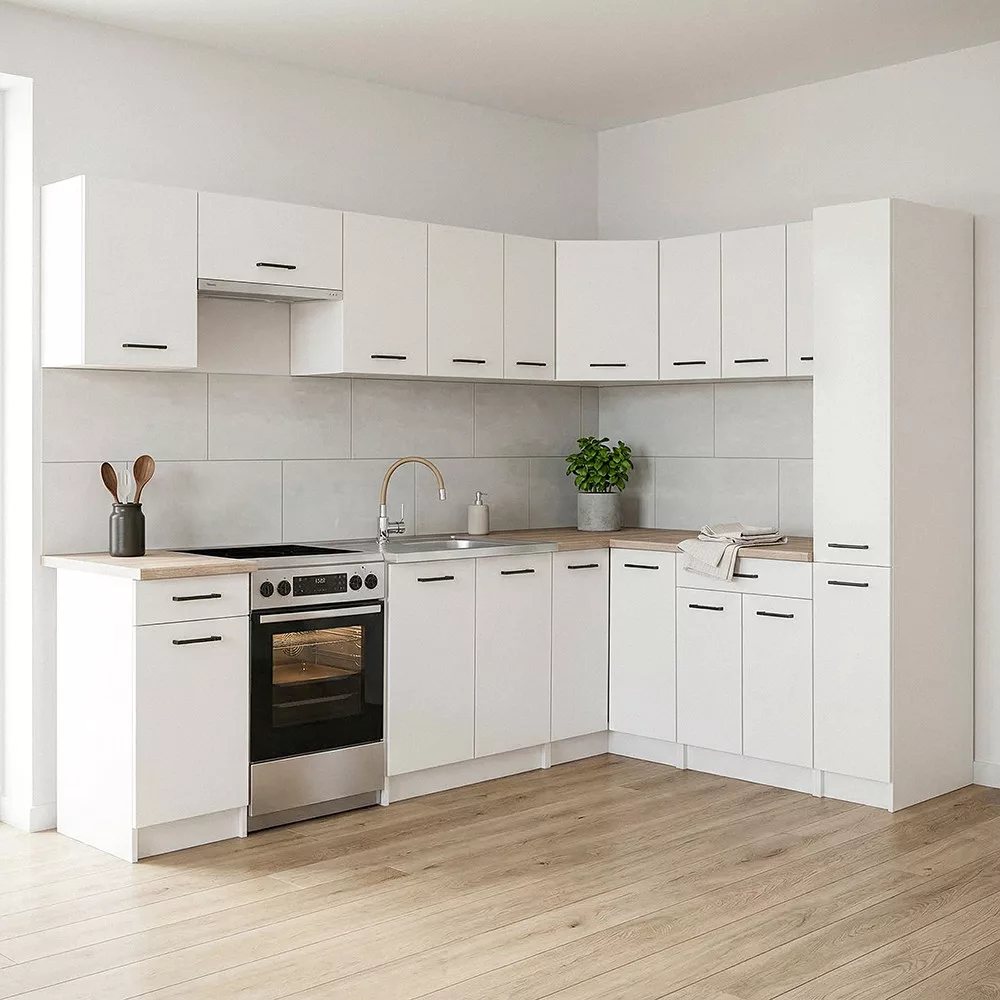 A Praktik sarok konyhabútor fehér korpusszal és fehér fronttal időtálló, letisztult megjelenést kínál, amely könnyedén illeszkedik bármilyen lakberendezési stílushoz. Világos színvilága optikailag tágítja a teret, így ideális választás különböző méretű konyhákba.