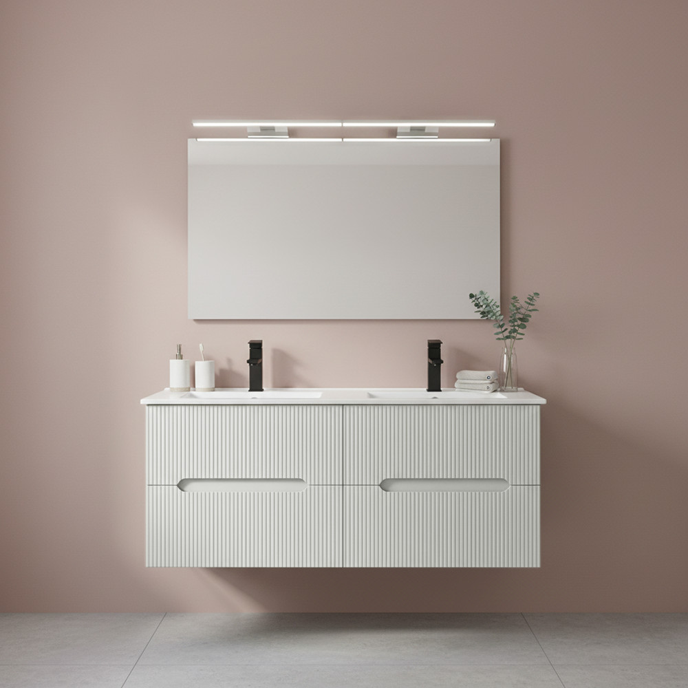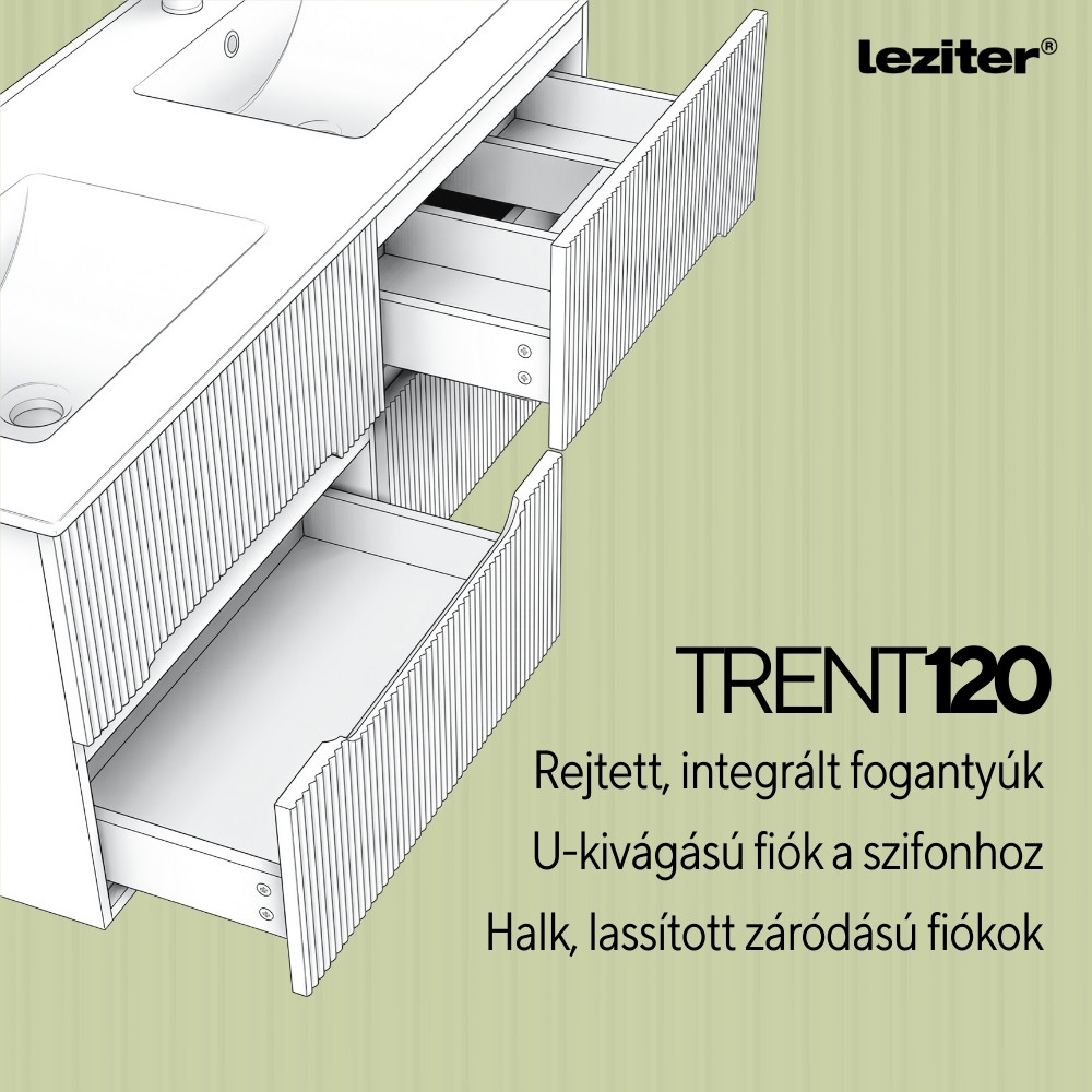 A Leziter Trent fürdőszobabútor harmonikusan ötvözi a látványt és a praktikumot. A bordázott előlap letisztult, modern karaktert ad, miközben az integrált fogantyú kényelmes használatot tesz lehetővé. A fali rögzítés könnyed megjelenést teremt, a padló takarítása pedig gyorsabbá válik.
