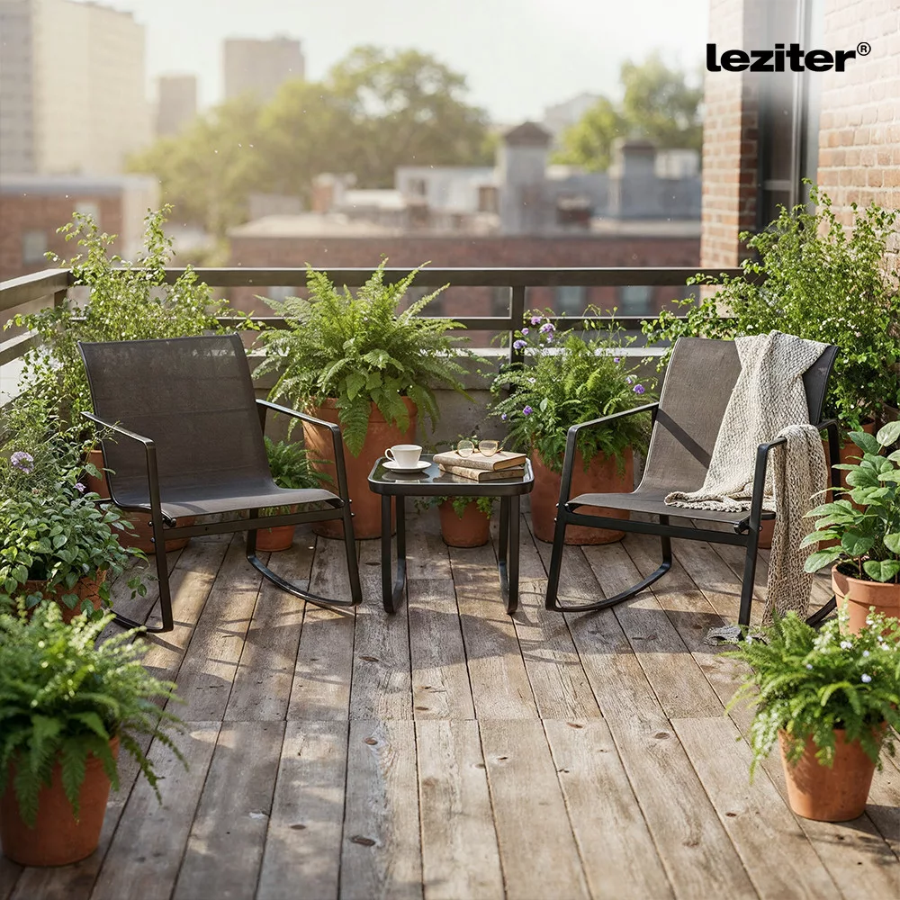 A Leziter Elva Balcony kerti bútor garnitúra szett kompakt kialakítású összeállítás, amely két hintaszékből és egy kávézóasztalból áll. A szett méretezése lehetővé teszi, hogy kisebb erkélyeken, teraszokon vagy városi kültéri terekben is jól használható legyen. A hintaszékek kialakítása pihenéshez és rövid kávézáshoz egyaránt alkalmas elrendezést biztosít.