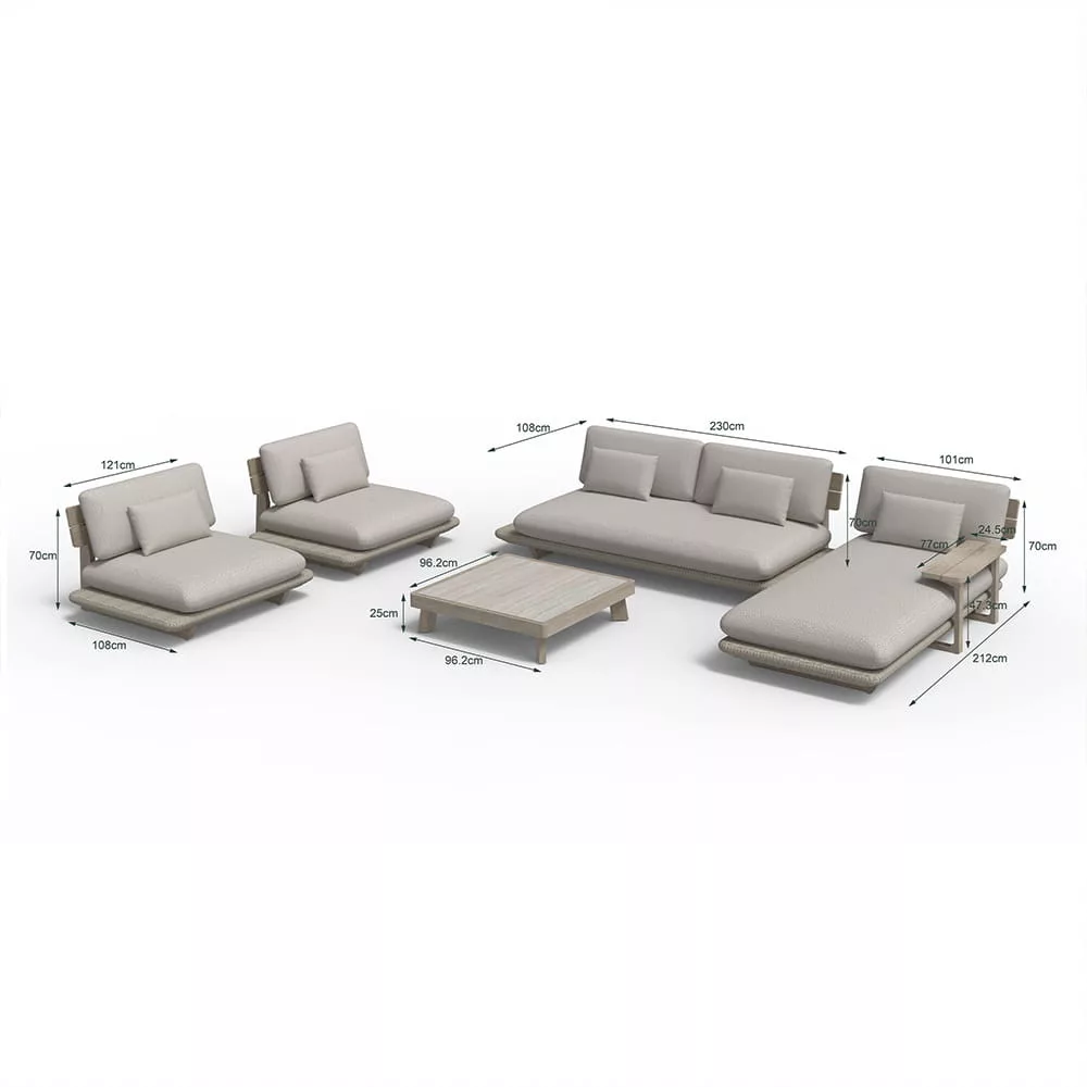 - Méretek: Fotelek: 121 x 108 x 70 | Kétszemélyes kanapé: 230 x 108 x 70 | Dohányzóasztal: 96,2 x 96,2 x 25 | Nyugágy: 212 x 101 x 70 | Leányasztal: 77 x 24,5 x 47,3